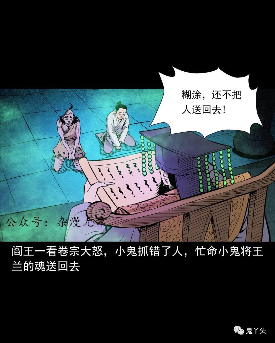 说是利津县有个叫王兰的人,这一夜正在酣睡,被一个勾魂小鬼用锁链缠住了脖子!牵着他走了很久,来到了地府,等阎王发落,阎王一看卷宗大怒,小鬼抓错了人,忙命小鬼将王兰的魂送回去,可等送回去一看,王兰早已下葬,尸身已经腐坏!小鬼怕阎王责罚,就想了个主意!他知道有