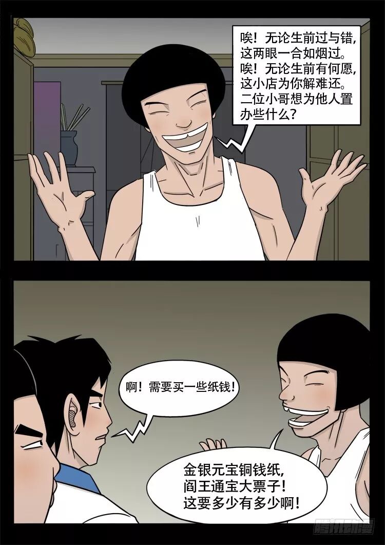 唉!无论生前过与错,这两眼一合如烟过。唉!无论生前有何愿这小店为你解难还。二位小哥想为他人置办些什么?